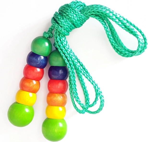 Klasyczna kolorowa skakanka HESS z drewnianymi rączkami dla dzieci od 3 lat. Dzięki regulowanej długości 2,3 m rośnie razem z dzieckiem, wspiera rozwój motoryki i koordynacji i jest wykonana z ekologicznego drewna z trwałymi, bezpiecznymi farbami.