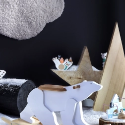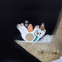 Zestaw zawiera podstawę z misiem, 12 elementów i kostkę z kolorami. Wszystko wykonane z wysokiej jakości drewna z poetyckimi ilustracjami Michelle Carlslund. Dzięki kompaktowym wymiarom to idealna gra podróżna i piękna designerska zabawka do pokoju dziecięcego.