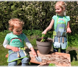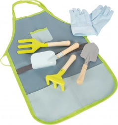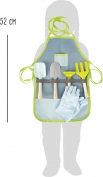 - Kompletny zestaw: fartuch, rękawiczki i 4 sztuki narzędzi (szpadel, grabki, łopatka, widelec)