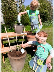 W zestawie znajdują się także rękawiczki, które chronią dziecięce ręce, oraz fartuch zapobiegający zabrudzeniu ubrań podczas ogrodniczych prac i tworzenia.