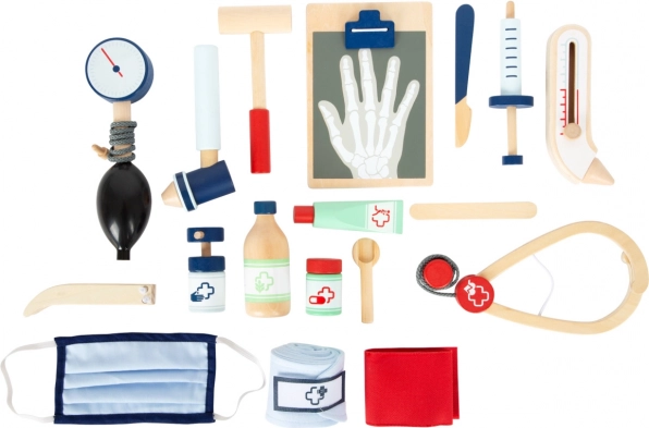 W zestawie bogate akcesoria: stetoskop, termometr z regulowaną temperaturą, strzykawka z ruchomym mechanizmem, otoskop z prawdziwą lupą, a także ciśnieniomierz z mankietem i balonikiem, płyn do dezynfekcji z pompką, buteleczki, łyżeczka, pęseta, skalpel, młoteczek neurologiczny oraz tekstylnie maseczki. Dzieci wypróbują opiekę nad „pacjentem”, poznają podstawy pielęgnacji i oswoją strach przed wizytą u lekarza.