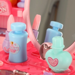 - Bogaty zestaw akcesoriów: lusterko, grzebień, dziecięca „suszka”, spinki, pierścionki, bransoletki, naklejki i buteleczki imitujące lakier do paznokci oraz perfumy.