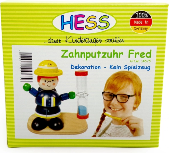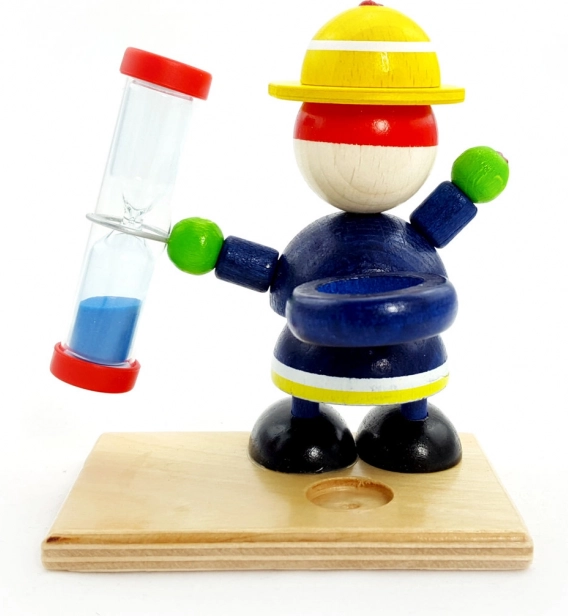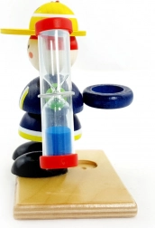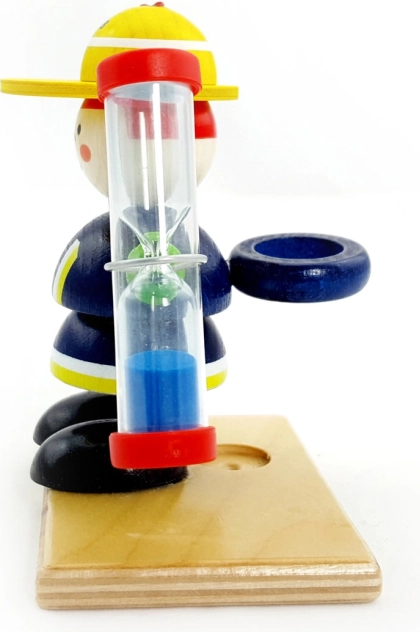 Ta kolorowa drewniana zabawka w kształcie figurki trzymanej przez strażaka jest nie tylko dekoracyjna, ale także funkcjonalna. Klepsydra może służyć jako oryginalny minutnik z niebieskim piaskiem, stanowiąc wesoły dodatek do pokoju dziecięcego. Czas przesypywania wynoszący 2 minuty jest idealny do motywowania dzieci do mycia zębów.