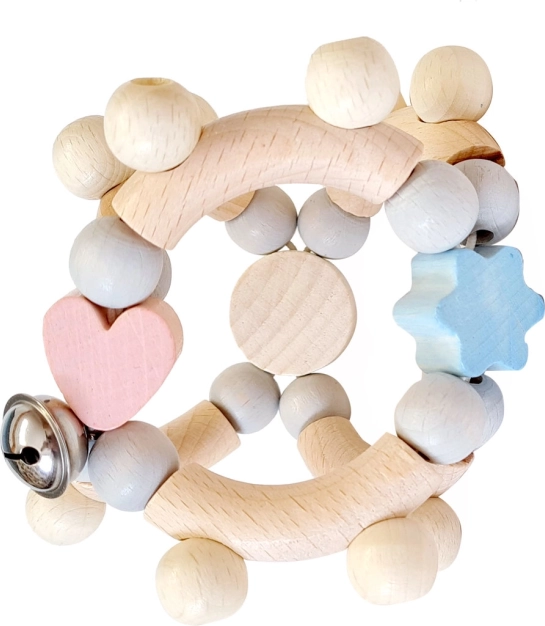 Drewniana motoryczna grzechotka marki Hess zachwyca pastelowymi kolorami i dzwoneczkiem, które wspierają wyobraźnię i poprawiają drobną motorykę dziecka.