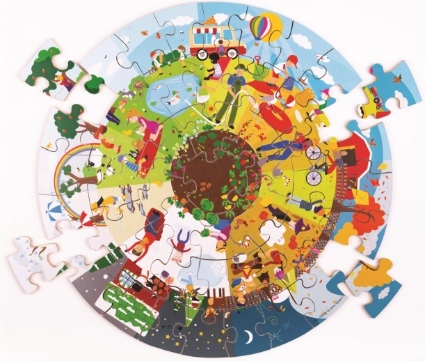 Dziecięce okrągłe podłogowe puzzle Bigjigs Toys wprowadzają dzieci w zmiany sezonowe w unikalny sposób. Każdy element jest starannie zaprojektowany, aby tworzyć pełną scenę 360 stopni, przedstawiającą różnorodne aktywności i krajobrazy typowe dla wiosny, lata, jesieni i zimy.