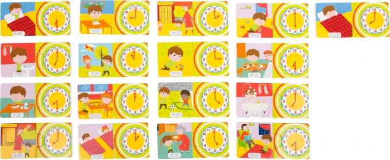 Która jest godzina? Dzięki uroczym obrazkom codziennych czynności dzieci w zabawny sposób nauczą się odczytywać czas dzięki tej grze. Zawsze należy dopasować dwie części. Gra może być również używana jak memory. Uczy nie tylko czasu, ale także wspiera motorykę małą i komunikację. Świetna gra edukacyjna, która jest naprawdę zabawna dla każdego. Główne zalety: uczy rozpoznawania czasu, może być używana także jako memory, ćwiczy umiejętności motoryczne