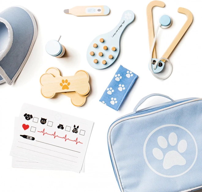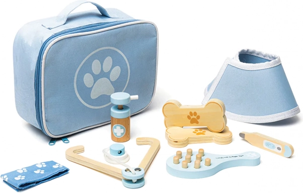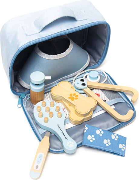 Kompletny weterynaryjny kuferek pozwala dzieciom opiekować się pluszakami i figurkami zwierząt jak prawdziwy lekarz. W zestawie znajdują się narzędzia, takie jak stetoskop, termometr, otoskop, strzykawka, bandaż, szczotka, kołnierz ochronny i inne akcesoria. Wszystko mieści się w wytrzymałej torbie tekstylnej z łapką, idealnej do przenoszenia i przechowywania.
