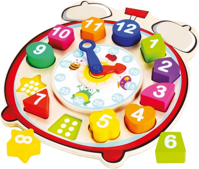 Ta wielofunkcyjna drewniana zabawka edukacyjna łączy układankę z zegarem. Kolorowe elementy o różnych kształtach z cyframi wkłada się w odpowiadające im otwory, a pod elementami zaznaczone są kropki dla łatwiejszej orientacji i pierwszego liczenia. Obracane wskazówki godzinowa i minutowa pomagają dzieciom zrozumieć zasadę mierzenia czasu w ciekawy i obrazowy sposób.