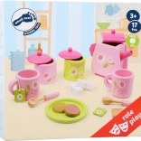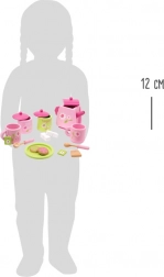 Ten zestaw wykonany jest z wysokiej jakości drewna, co zapewnia długotrwałą zabawę i bezpieczeństwo dla dzieci. Dzięki zdejmowanym pokrywkom w dzbanuszku i ogólnie solidnemu wykonaniu dzieci mogą łatwo manipulować poszczególnymi elementami.
