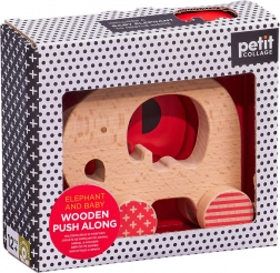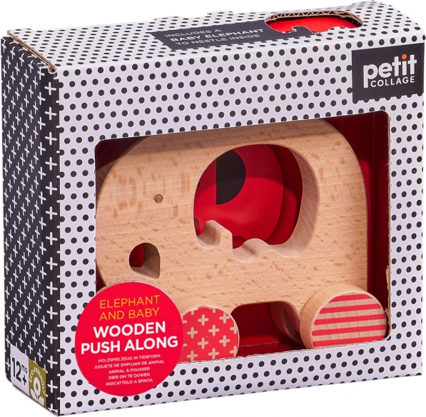 Zabawka rozwija umiejętności podczas ciągnięcia i pchania, trenuje chwyt i wyobraźnię przestrzenną dzięki słoniątku, które wkłada się w otwór pośrodku. Wytrzymała konstrukcja z litego buku gwarantuje długą żywotność i łatwą pielęgnację.