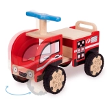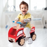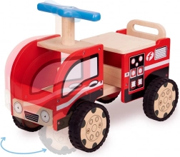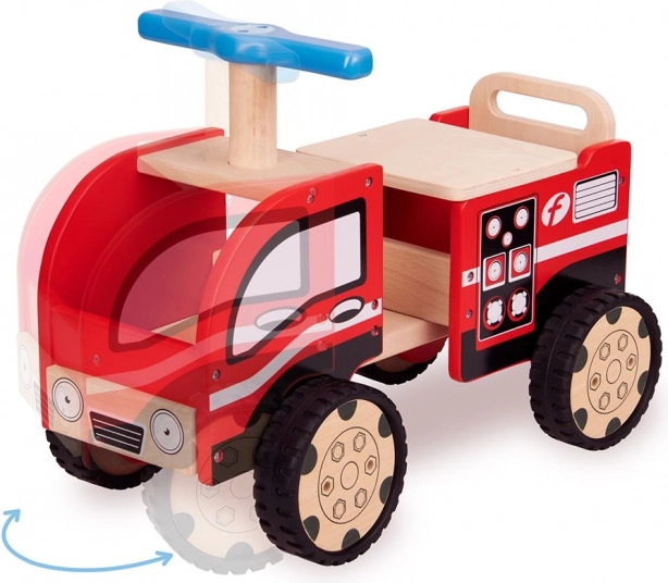Drewniany jeździk w kształcie wozu strażackiego z realistycznymi detalami wspiera zabawę i inspiruje do wyobraźniowej gry.