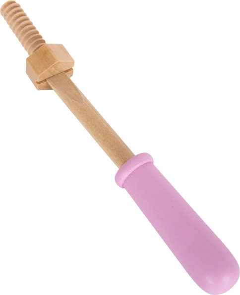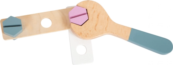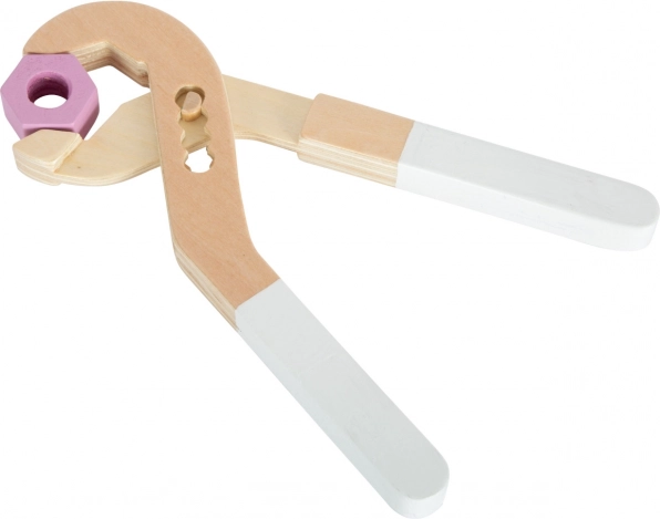 Drewniane narzędzia, w tym klucz nastawny, grzechotka, śrubokręt i klucz, oferują różne możliwości zabawy i nauki.