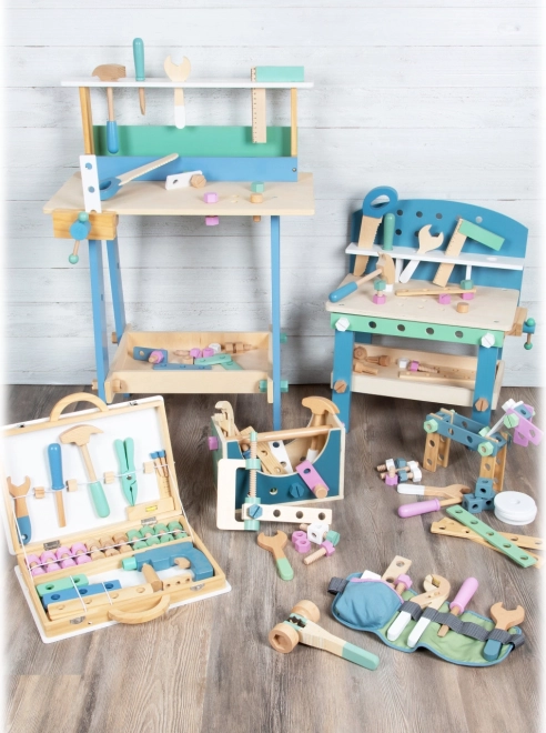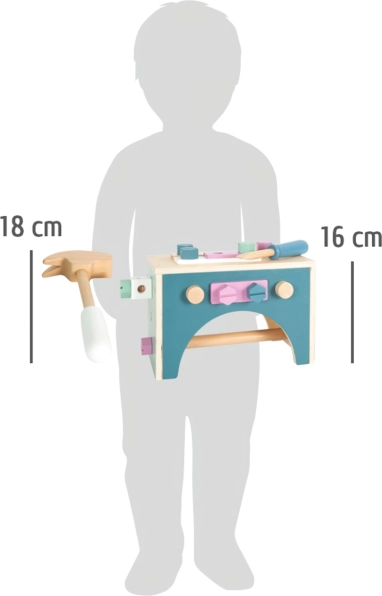 Ta drewniana skrzynka z narzędziami jest idealna dla dzieci, które chcą naśladować prawdziwe naprawy i prace rzemieślnicze. Prosty skandynawski design w delikatnych pastelowych kolorach świetnie pasuje do każdego pokoju dziecięcego: