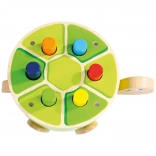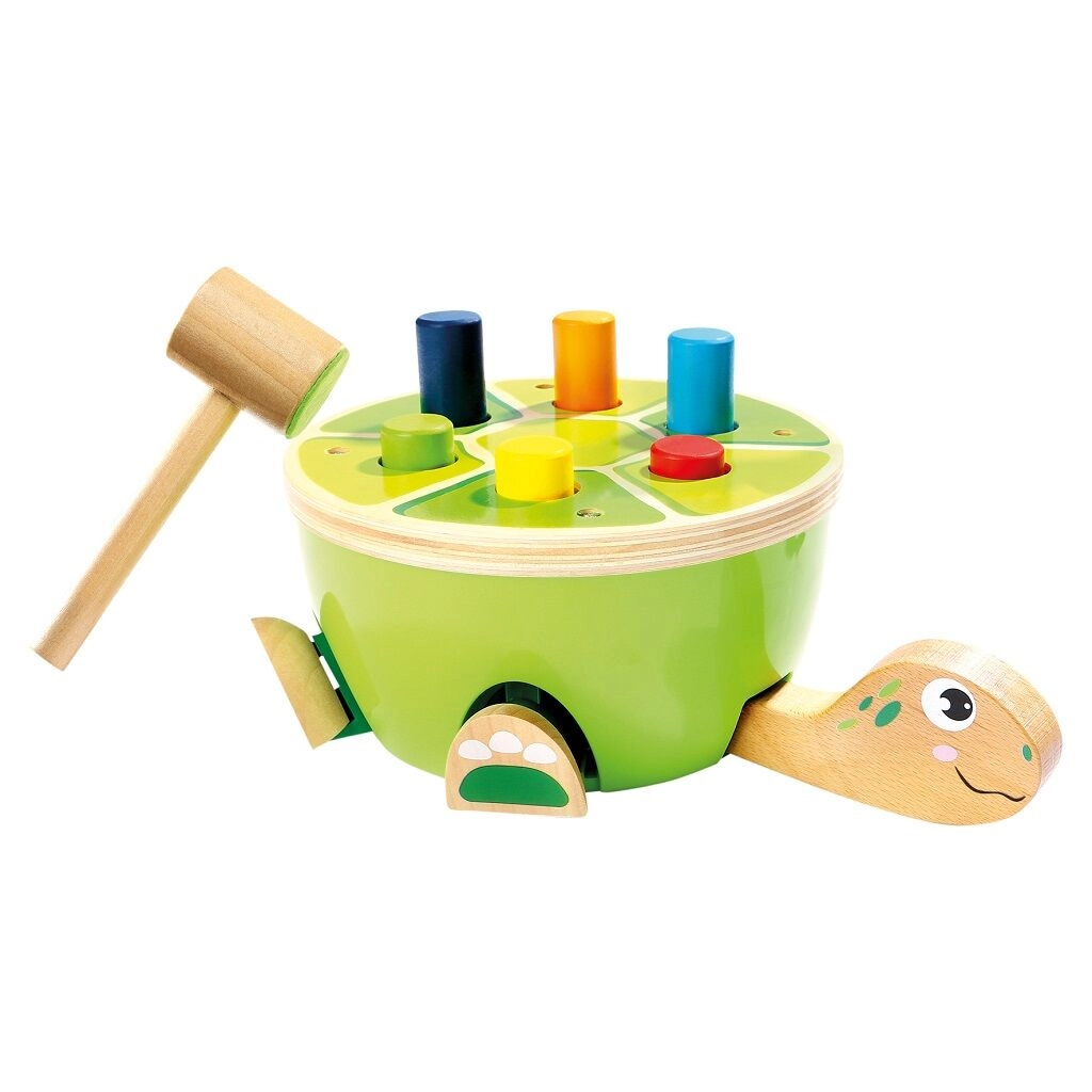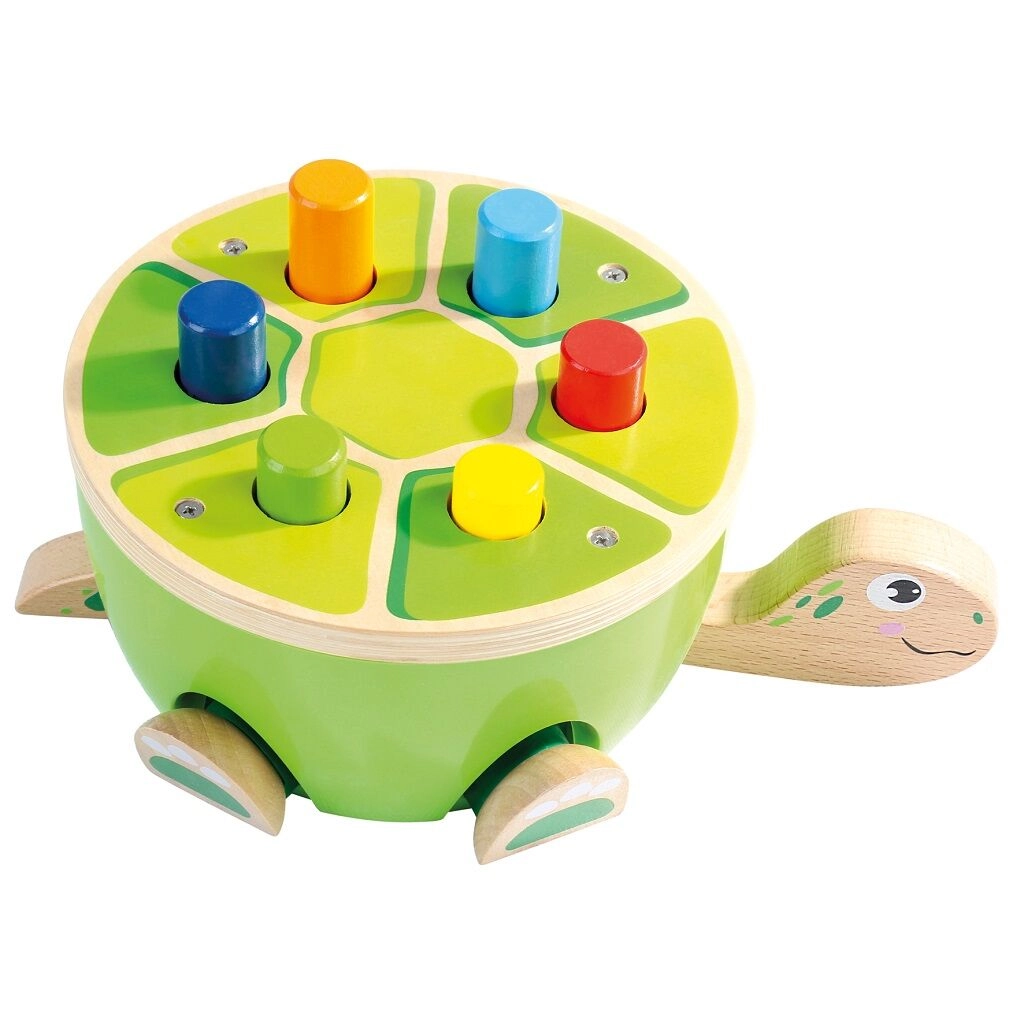 Ta żółwia ławeczka do wbijania od Bino to idealny wybór na pierwsze gry motoryczne. Dzieci przy pomocy drewnianego młotka z miękkim filcowym pokryciem bezpiecznie wbijają kolorowe kołeczki w pancerz. Podczas zabawy naturalnie rozwijają się mała motoryka, koordynacja ręka–oko oraz koncentracja, a dzięki wesołemu wyglądowi zabawka utrzymuje uwagę na długi czas.