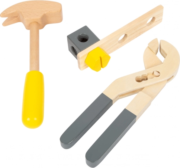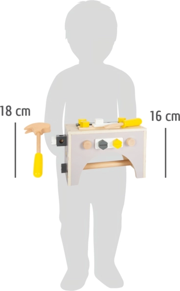 Młotek, klucz, śrubokręt, klucz nastawny i imadło – wszystko z wytrzymałego drewna. Dzieci w zabawny sposób ćwiczą podstawowe „rzemieślnicze” umiejętności.