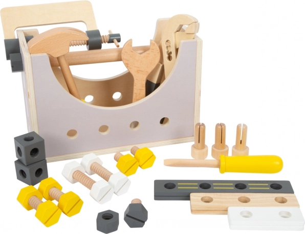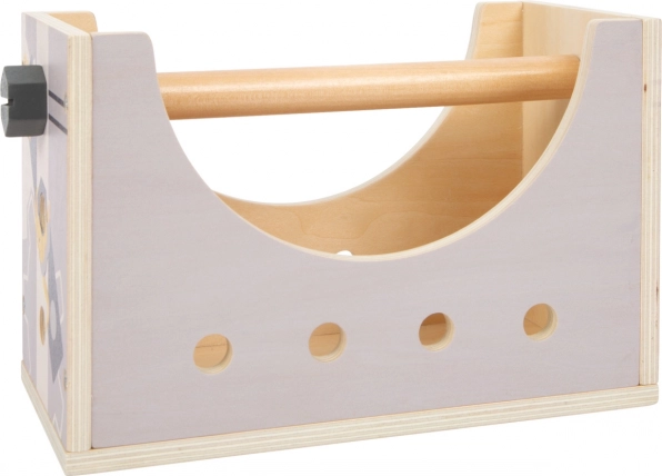 W zestawie znajduje się 5 sztuk drewnianych narzędzi – młotek, klucz, śrubokręt, klucz nastawny i imadło – oraz wiele dodatków do kreatywnych projektów. Odpinana rączka i praktyczne otwory pozwalają szybko uporządkować narzędzia, dzięki czemu skrzynka jest idealna także w podróży.