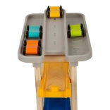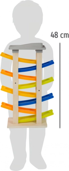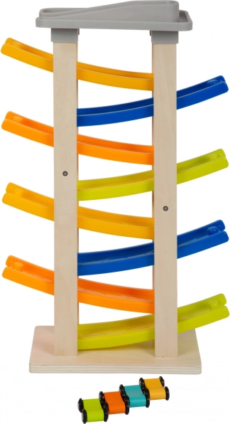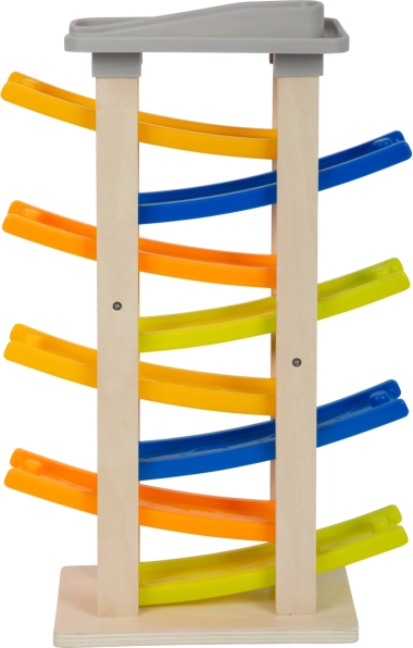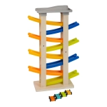 Poznaj ten unikalny tor wyścigowy z ośmioma rampami, który zachwyci każdego małego zawodnika. Na szczycie toru znajduje się wygodny parking dla czterech drewnianych samochodzików. Ta zabawka wspiera akustyczne postrzeganie dzięki stukającym dźwiękom, które wytwarzają samochodziki podczas zjazdu. Dzięki swojej szerokiej podstawie tor jest wyjątkowo stabilny i bezpieczny.