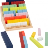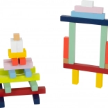 Kolorowe drewniane kostki pomagają rozwijać wyobraźnię wizualną i rozpoznawanie kolorów.