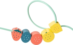 Kolorowe koraliki w kształcie owoców na elastycznym prowadniku wspierają rozwój małej motoryki i koordynacji ruchowej podczas codziennej zabawy.