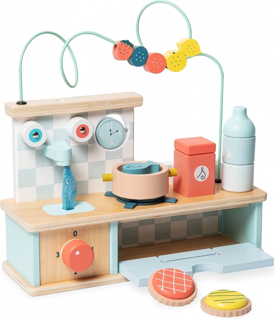 Obrotowe pokrętła, garnek z rybką, zlew z kurkami i otwierana piekarnik pobudzają wyobraźnię i uczą dzieci codziennych czynności w kuchni.