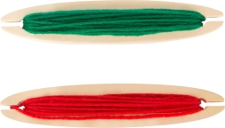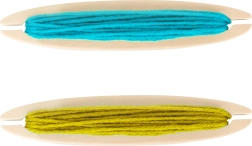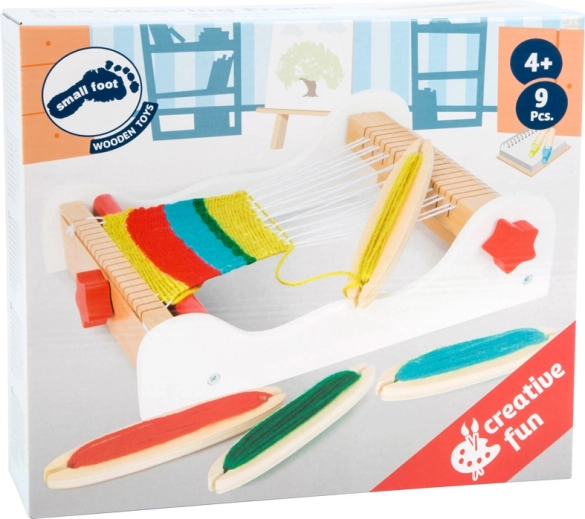 Cztery drewniane szpulki z kolorową przędzą oraz nici bazowe umożliwiają rozpoczęcie tworzenia bez dodatkowych zakupów – wystarczy rozpakować i tkać.