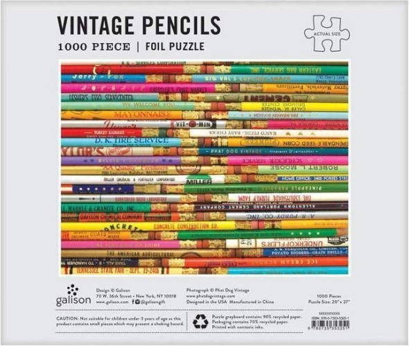 Stylowe puzzle z motywem kolorowych, vintage’owych ołówków od GALISON i PHAT DOG VINTAGE oferują 1000 elementów z drobnymi detalami. Zachwycą błyszczące akcenty ze złotej folii, premium jakość oraz idealnie dopasowane elementy z papieru z recyklingu. W zestawie znajduje się broszura informacyjna o artyście oraz solidne, prezentowe pudełko z matowym wykończeniem.