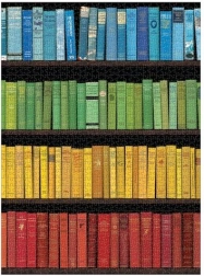 Ta fotografia kolorystycznie zestawionych książek ukazuje piękno i fakturę biblioteki.