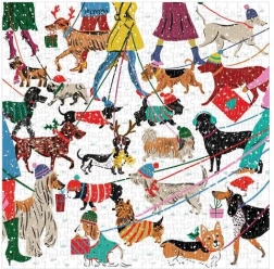 Puzzle oferują magiczną ilustrację z motywem zimowych piesków i ich właścicieli w świątecznej atmosferze.