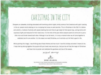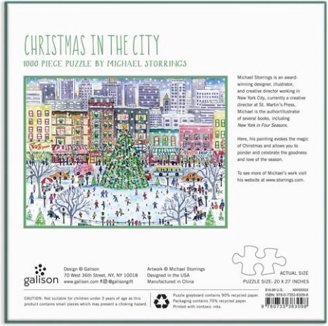 Świąteczne puzzle oddają atmosferę miejskich Świąt z magiczną sceną łyżwiarzy pod lśniącą choinką. Puzzle zapakowane są w solidne pudełko z matowym wykończeniem, co czyni je doskonałym prezentem.