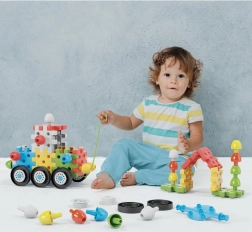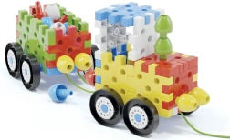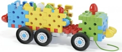 Buduj z płaskich elementów i kołeczków samochodziki, domki i drzewa! Ta innowacyjna zabawka konstrukcyjna zawiera wzajemnie łączone płaskie elementy 3D oraz duże, kolorowe kołeczki, dzięki którym nawet małe dzieci mogą składać różne samochodziki, domy, wieże, drzewa i wiele innych rzeczy. Wśród łącznie 62 elementów zestawu znajduje się 8 kółek na podwozia autek oraz 3 sznurki, na których można je ciągnąć. Oprócz różnych samochodzików zestaw pozwala tworzyć także rozmaite konstrukcje płaskie i przestrzenne, ćwicząc u dzieci w wieku od 2 do 6 lat małą motorykę, koordynację ręka-oko i orientację przestrzenną, a jednocześnie wspierając ich rozwój poznawczy. Zawartość opakowania: 20 wzajemnie łączonych płaskich elementów 3D, 16 wzajemnie łączonych kołeczków, 8 kółek, 3 sznurki do ciągnięcia autek. Najważniejsze cechy: rozwija małą motorykę, kreatywność, wyobraźnię oraz myślenie logiczno-kombinacyjne; opakowanie zawiera 52 elementy; dla dzieci od 2 lat.