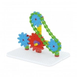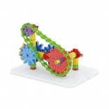 Zestaw wykonany z trwałego plastiku i przeznaczony dla dzieci od 5 lat. Zawiera komponenty takie jak biała podstawowa płyta, koła zębate różnej wielkości, łańcuch i wiele innych, co pozwala dzieciom odkrywać nowy świat ruchów mechanicznych.