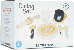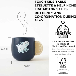 W zestawie znajdziesz wszystko do małego serwowania: filiżankę, spodek, kubek, 2 talerze, nóż, widelec, łyżkę oraz tekstylną serwetkę z dekoracyjnym pierścieniem. Dzieci podczas serwowania rozwijają kreatywność, sprawność manualną i uczą się podstaw savoir-vivre’u przy stole. Wykonano etycznie z zrównoważonego drewna FSC z naciskiem na jakość i bezpieczeństwo.