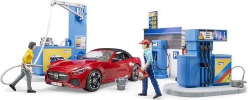 W komplecie znajduje się wszechstronne sportowe auto ze zdejmowanymi kołami i dachem, w pełni kompatybilne z figurkami i akcesoriami BRUDER BWORLD. Dwustronnie zadrukowane tła, półki z kanistrami i cennik wspierają kreatywną i edukacyjną zabawę.