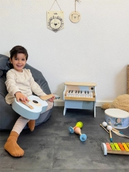 W zestawie znajdują się nuty oraz dwie kostki dla małych i większych dłoni, aby dzieci mogły zacząć grać natychmiast. Gitara wspiera naturalny rozwój słuchu akustycznego, koordynacji palców i poczucia rytmu.