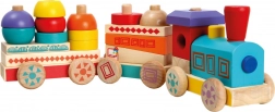 Kolorowy drewniany pociąg w rozmiarze „MAXI” jest jednocześnie zabawką do ciągnięcia i klockową układanką. Układając wagoniki z klocków o różnych kształtach, maluchy mogą rozwijać wyobraźnię i umiejętności motoryczne. Wykonany z trwałego litego drewna. Główne cechy: 3 podwozia i 18 różnych klocków, rozmiar MAXI, wytrzymałe drewniane wykonanie