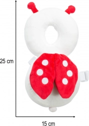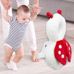 Okrągła poduszka za głową amortyzuje upadki na plecy i chroni wrażliwy kark podczas nauki chodzenia.