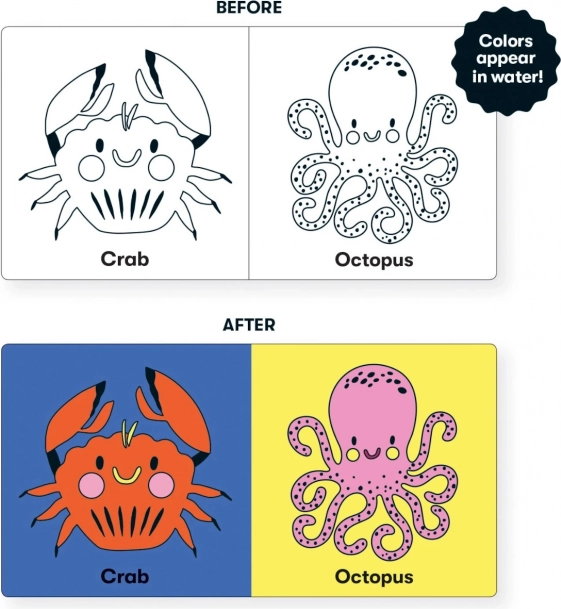 Odkryj urok wyjątkowych zabawek do kąpieli. Na pozór niepozorna obrazkowa książeczka po zanurzeniu uroczo ożywa różnobarwnymi kolorami. Łatwo przyciąga uwagę dzieci i bawi je podczas mycia, jednocześnie pomagając rozwijać ich umiejętności poznawcze. Proporcje zabawki są specjalnie dostosowane do drobnych i jeszcze niezdarnych dziecięcych rączek. Główne cechy: 6 stron z ilustracjami, aktywacja kolorów po zanurzeniu w wodzie, projekt graficzny Marijke Buurlage