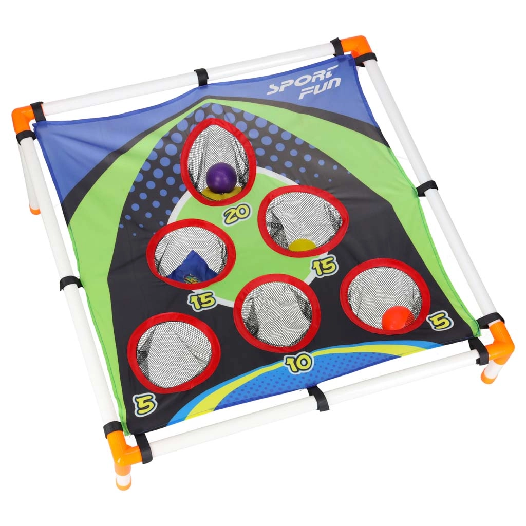 Lekka konstrukcja z plastikowych rurek z pochylonym stojakiem zapewnia stabilność, a wytrzymała tekstylna powierzchnia z pięcioma do sześciu punktowanymi otworami zatrzymuje woreczki i piłeczki w siateczkach. Montaż jest intuicyjny, a całe „boisko” łatwo przenieść gdziekolwiek.