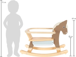 Bezpieczeństwo na pierwszym miejscu: zdejmowana barierka i wysokie oparcie utrzymują młodszych jeźdźców w siodle, ograniczniki zapewniają spokojne bujanie, a szerokie płozy gwarantują stabilność. Siodło na wysokości 26 cm ułatwia wygodne wsiadanie także młodszym dzieciom.