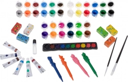 Zestaw obejmuje różne narzędzia takie jak kredki, markery, pastele olejne, farby oraz pędzle, co wspiera kreatywne wyrażanie.