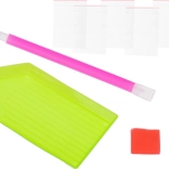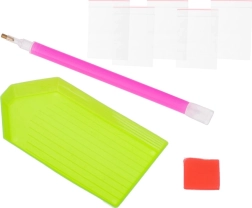 W zestawie znajduje się wszystko, co potrzebne do stworzenia lśniącego dzieła sztuki: obraz, kolorowe kamyki, aplikator, suche klej oraz tacka.