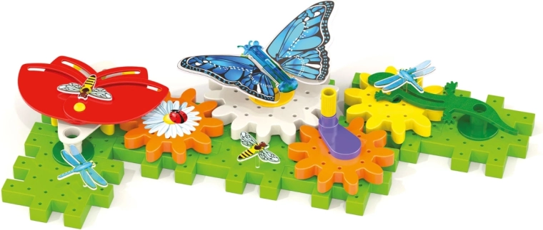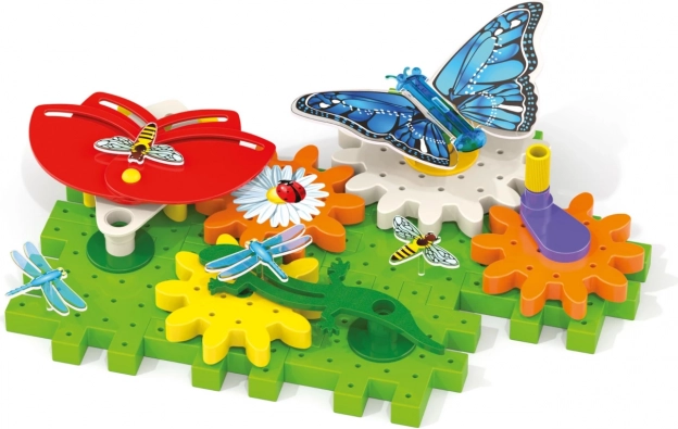 Połączone koła zębate wprawią w ruch motyla, kwiat i ważkę. Dzieci od razu widzą, jak przenosi się ruch – wciągająca mechanika na wyciągnięcie ręki.
