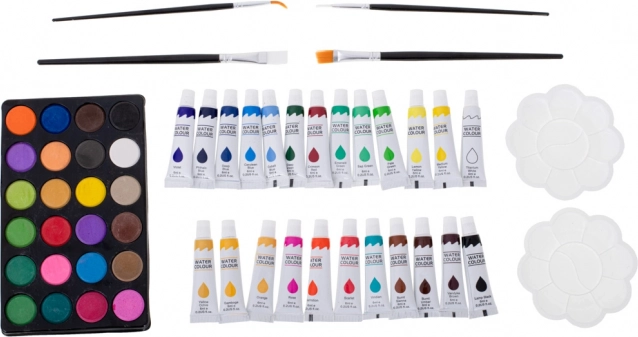 Paleta 24 akwareli, 24 farby w tubkach, pędzle i dwie plastikowe palety – kompletne wyposażenie do technik wodnych i kryjących.