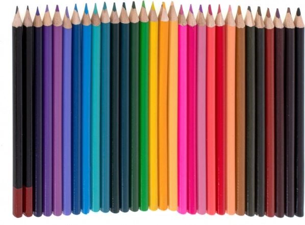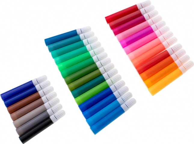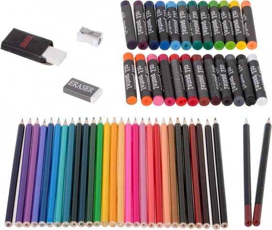 33× marker, 28× kredka, 4× pędzel, 2× ołówek, 2× gumka, 2× plastikowa paleta, 1× temperówka, 24× akwarela (paleta), 24× farba w tubce, 24× pastel olejny, 1× kuferek