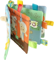 Książka składa się z czterech materiałowych stron, które zawierają krótki tekst w języku angielskim, co pomaga zaznajomić dzieci z językiem obcym już od wczesnego wieku.