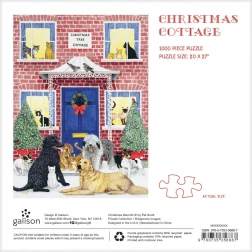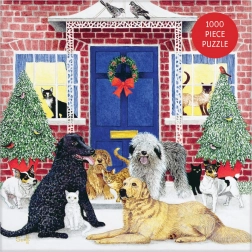 Odkryj magię Świąt w scenerii pełnej psów, kotów i świątecznych dekoracji przed przytulną chatką. Puzzle z 1000 elementów oferują radość z uważnego układania, a po ukończeniu tworzą piękny obraz, który cieszy oko i serce.