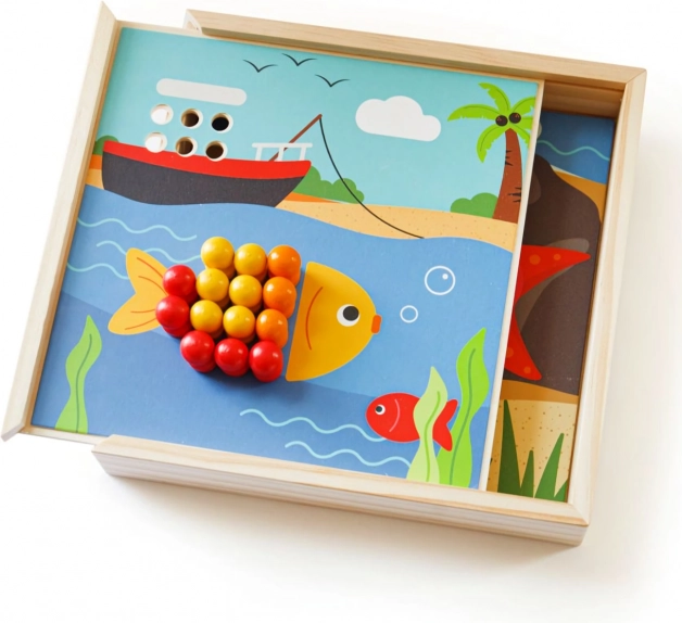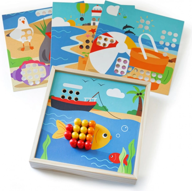 Odkryj zabawną mozaikę z motywem plaży, która rozwija dziecięcą wyobraźnię i umiejętności. Zawiera 4 obrazki i 96 kołeczków w 8 kolorach, które dzieci układają na wieczku praktycznego pudełka. Zabawa wspiera rozpoznawanie kolorów, motorykę małą, koncentrację oraz logiczne myślenie. Wykonana z wysokiej jakości, odpowiedzialnie pozyskiwanego drewna – przyjemnego w dotyku i idealnego w podróży.