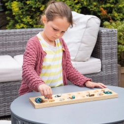 Mancala (znana także jako Kalaha) to elegancka gra strategiczna dla dwóch graczy, łącząca proste zasady z zaskakującą głębią. Ta drewniana wersja od Bigjigs Toys oferuje gładko wykończoną planszę i kolorowe szklane kamyki, które zachęcają do gry oraz ćwiczenia motoryki małej.