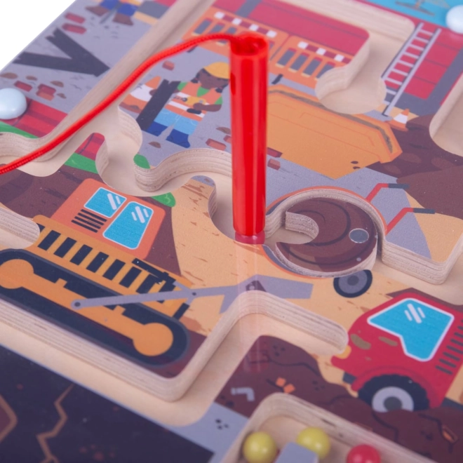 Ten wysokiej jakości drewniany magnetyczny labirynt z motywem placu budowy ucieszy dzieci od 3. roku życia. Za pomocą dołączonego magnetycznego wskaźnika dzieci przesuwają kolorowe kuleczki między koparkami, ciężarówkami i przeszkodami, ćwicząc logikę i orientację przestrzenną, a jednocześnie świetnie się bawiąc.