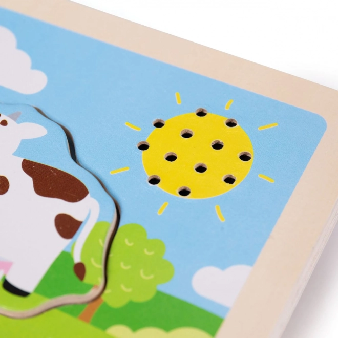 Drewniane elementy po włożeniu wydają charakterystyczne odgłosy zwierząt, co pozwala dzieciom przyporządkować dźwięk do właściwego zwierzęcia.